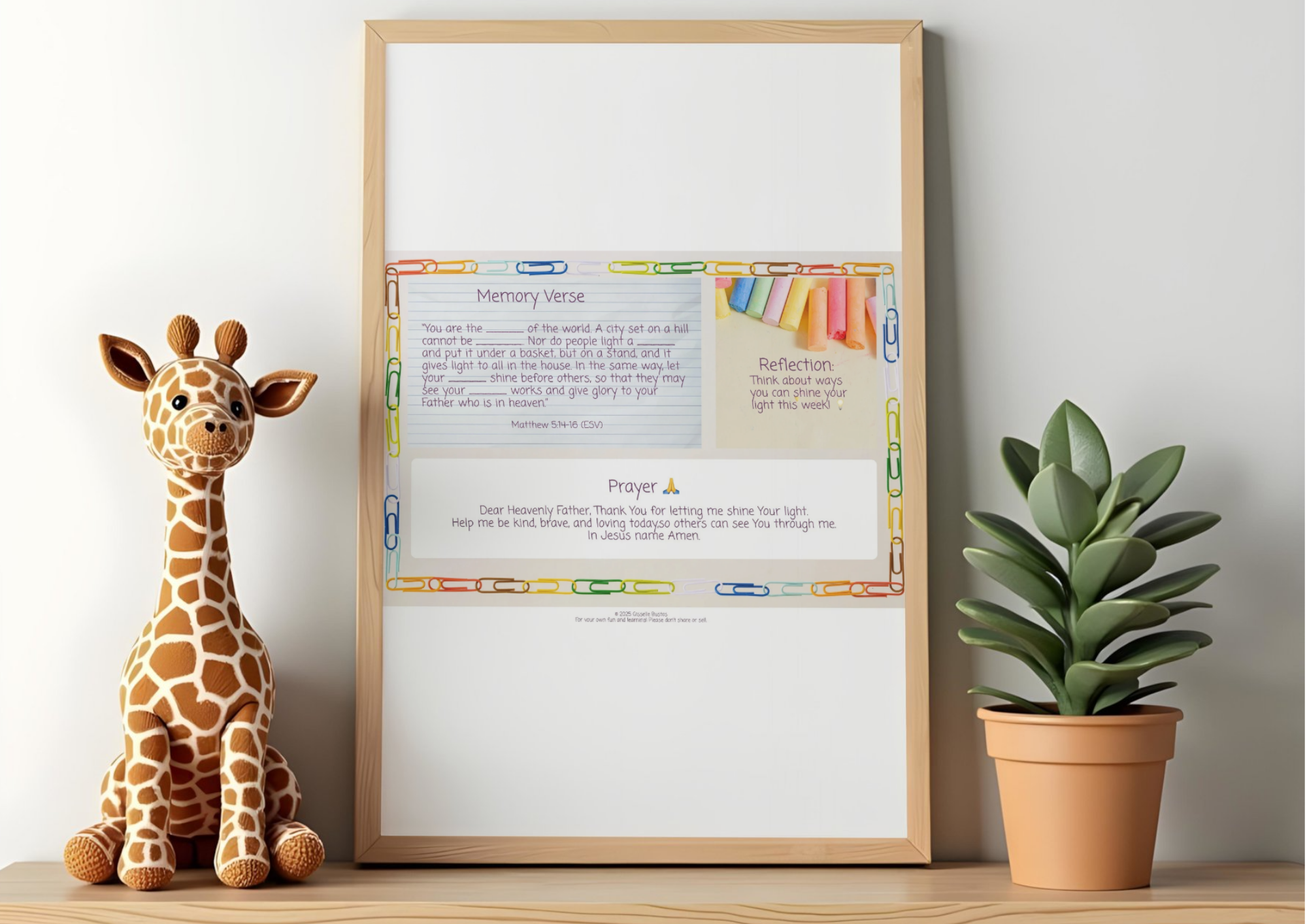 A fun, faith-filled printable for little ones! 2 pages Include a memory verse fill-in, reflection prompt, a short prayer, and a “Spot the Light” activity. Perfect for preschool and early elementary children.