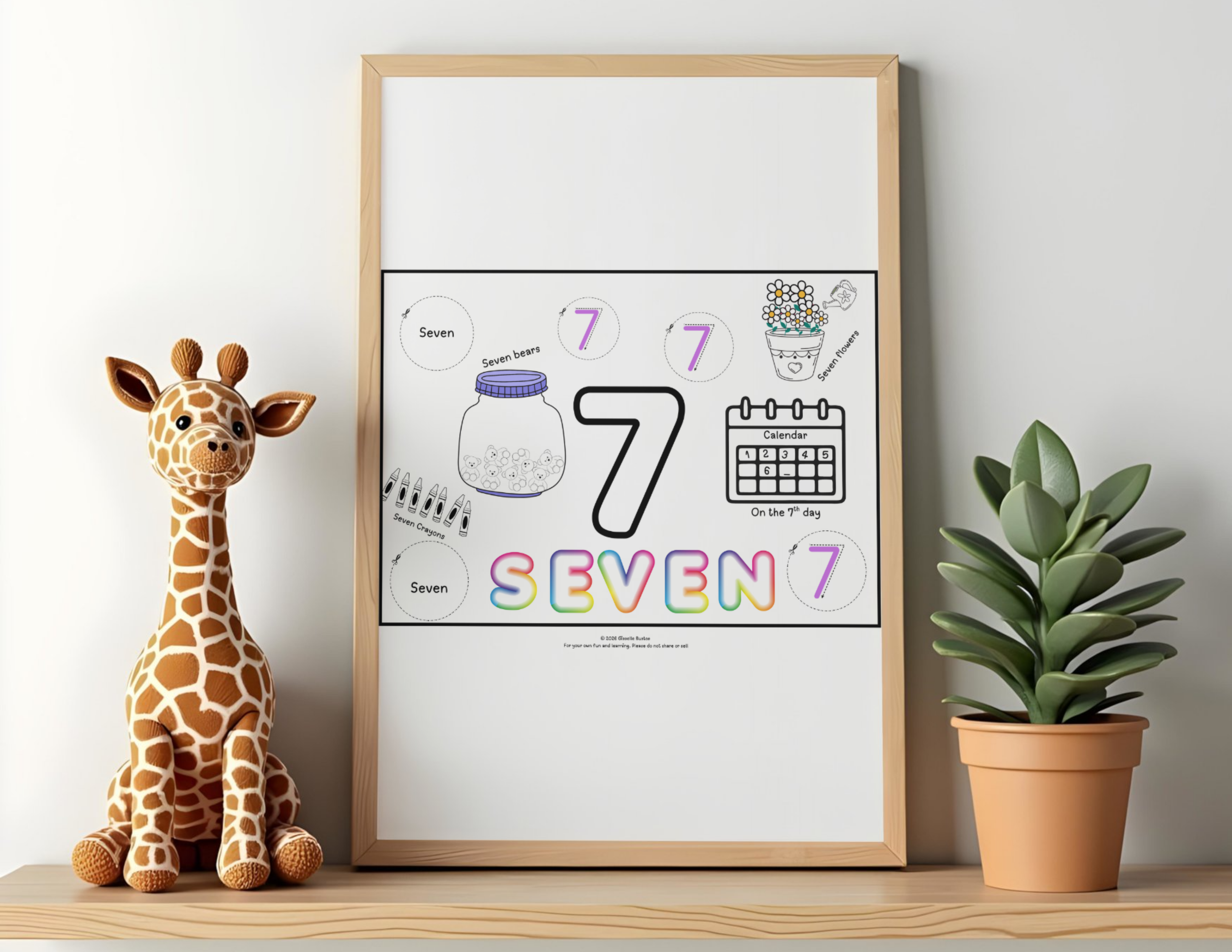 Page 2 Numerical Foundation: Focused on the number 7, representing completion and the Sabbath. Fine Motor Skills: Includes tracing exercises for the number 7 (word and numeral) and "cut-and-paste" style circles. Counting Fun: Features "Seven Bears," "Seven Crayons," and "Seven Flowers" to reinforce counting skills. Biblical Connection: Highlights the "7th Day" on the calendar, connecting the concept of sanctification to God’s rest.