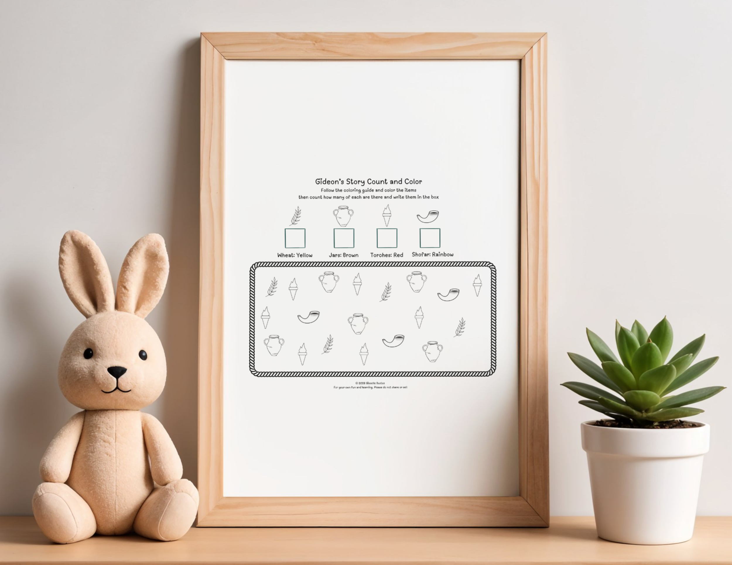 Page 2: Gideon’s Count & Color A hands-on way to explore Gideon’s story! Children follow the coloring guide for shofars, torches, and jars, then practice math by counting and recording the totals.